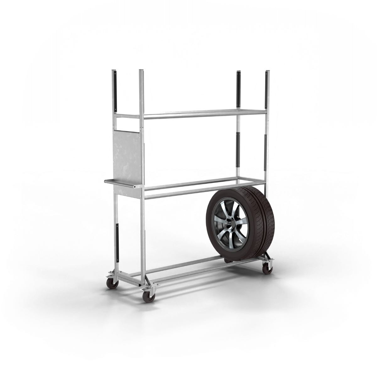 Le modèle AR33/3 est un chariot en acier d’une capacité de 600 kg, conçu pour le transport et le stockage vertical des pneus et roues.